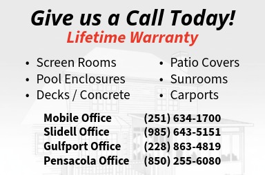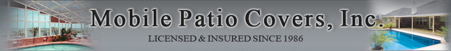 Mobile Patio Covers, Inc. is dedicated to bringing you the best in quality craftsmanship and customer service. We have been serving the entire Gulf Coast for over 24 years. We offer Patio Covers & Deck Covers, Screen Rooms, Screen Enclosures, Patio Enclosures, Patio Rooms, Canvas Awnings, Canopies, Siding, Hurricane Shutters, Aluminum Carports, Remodeling, Room Additions, Decks, Carports, Boat & RV Covers, Swimming Pool Enclosures, & Sunrooms. We are positive that you will find one of these low cost solutions perfect for your home improvement needs.